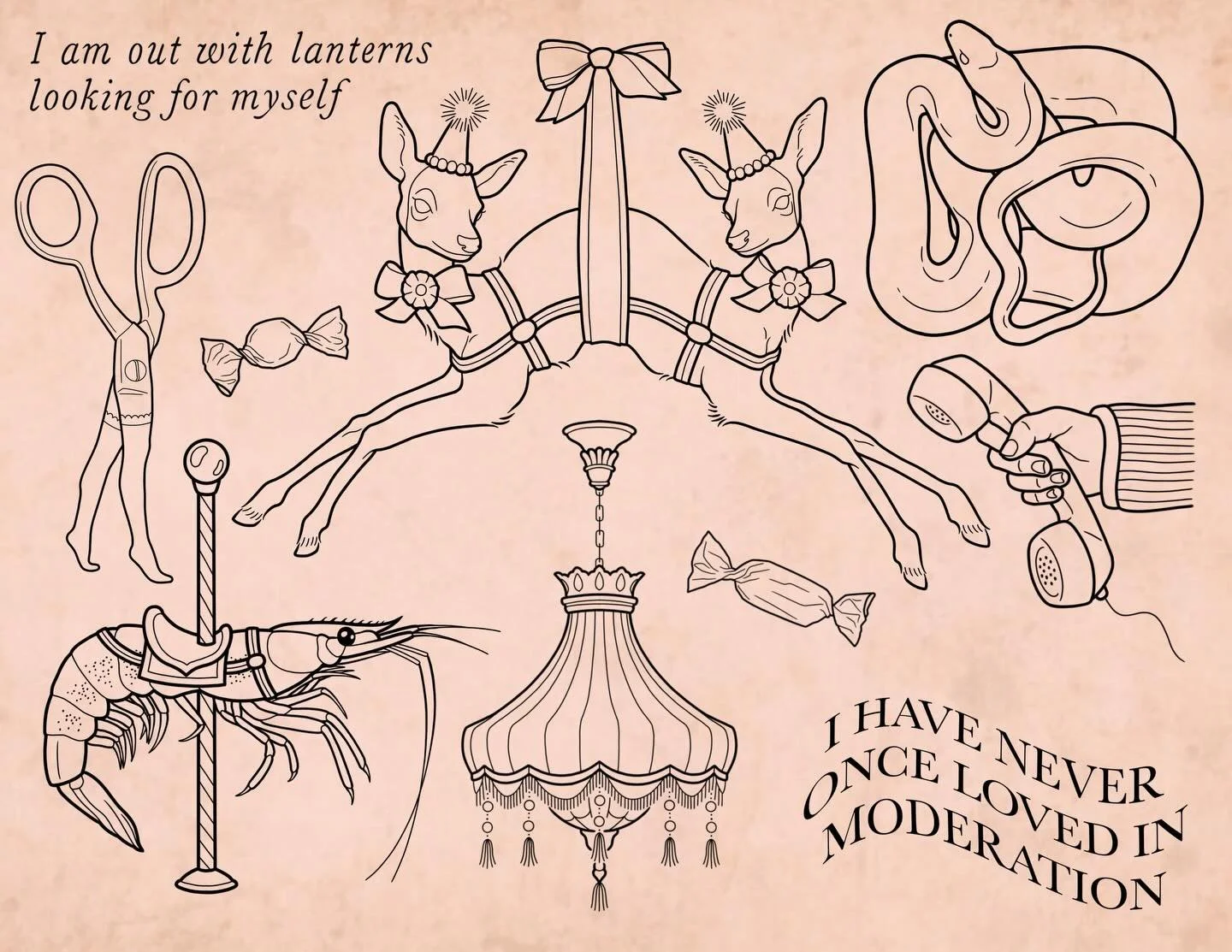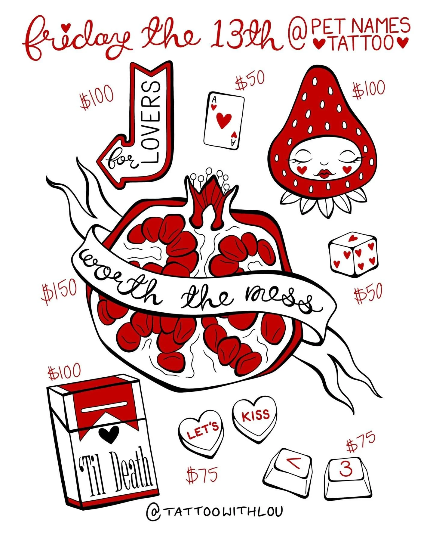 Flash tattoos are pre-drawn designs that are ready to be tattooed. I have flash centered around different themes, from sea creatures to cakes to fruits and vegetables.